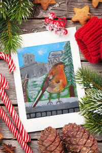 So for the second card featured in this blog I can credit my mum who said why don't you paint a robin in a churchyard with Carol singers in the background. Well the carol singers didn't make it into any of my paintings but the Robin and church yard did. In fact they made it into two. So I created this robin one for the Foundation trust, I liked it so much that I painted the same robin for my own series. Before this I showed the original to a friend and she asked me to do a commissioning for her restaurant. In the end I decided that I would include the Robin in this painting as well which featured a window looking into the restaurant. I enjoyed painting the Robin so much I did the same scene but with the church background a little changed for my own series of cards which are still available here on my website.